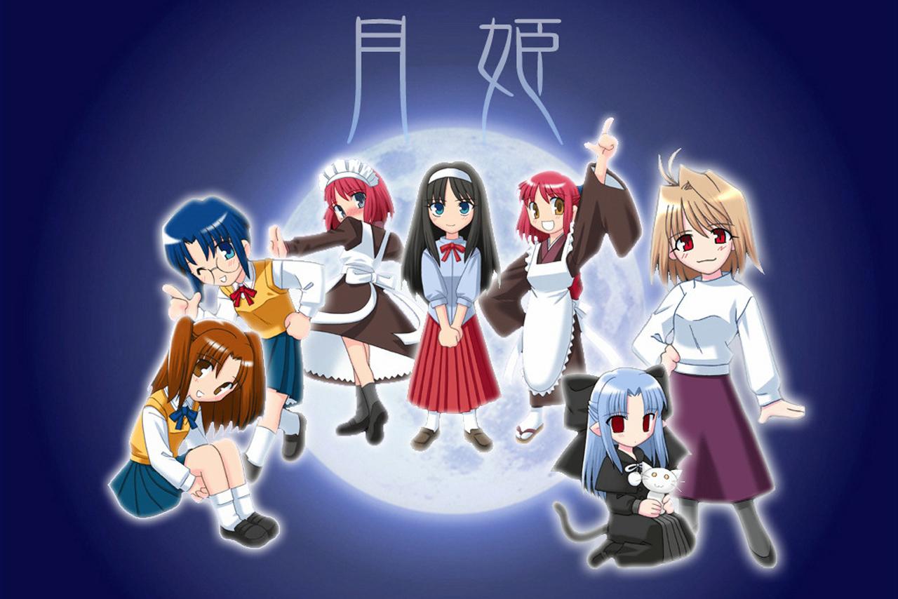 Description: A group of anime girls standing in front of a full moon with the moon in the background and the words written in chinese.