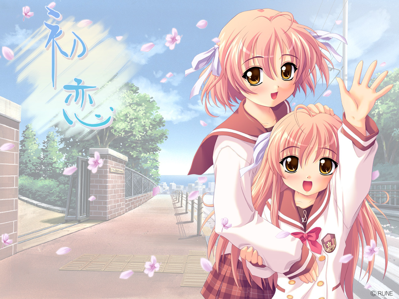 Description: Two anime girls are standing in front of a gate and trees and flowers are flying around them and the girl is holding the girl's hand up.