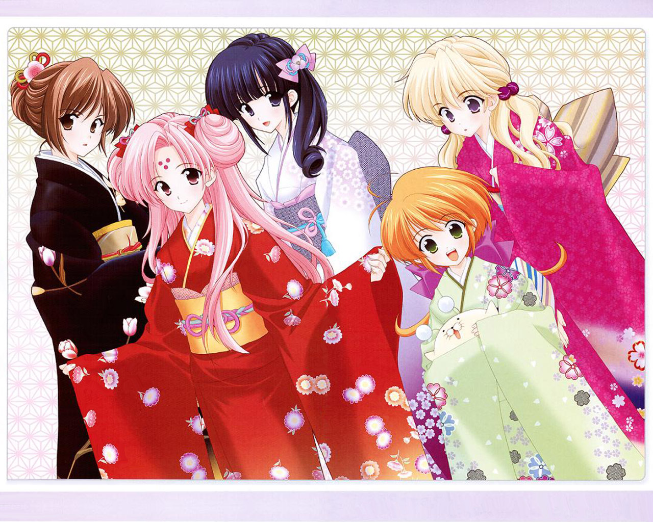 Description: A group of anime girls in traditional japanese dress and geisha hair styles.