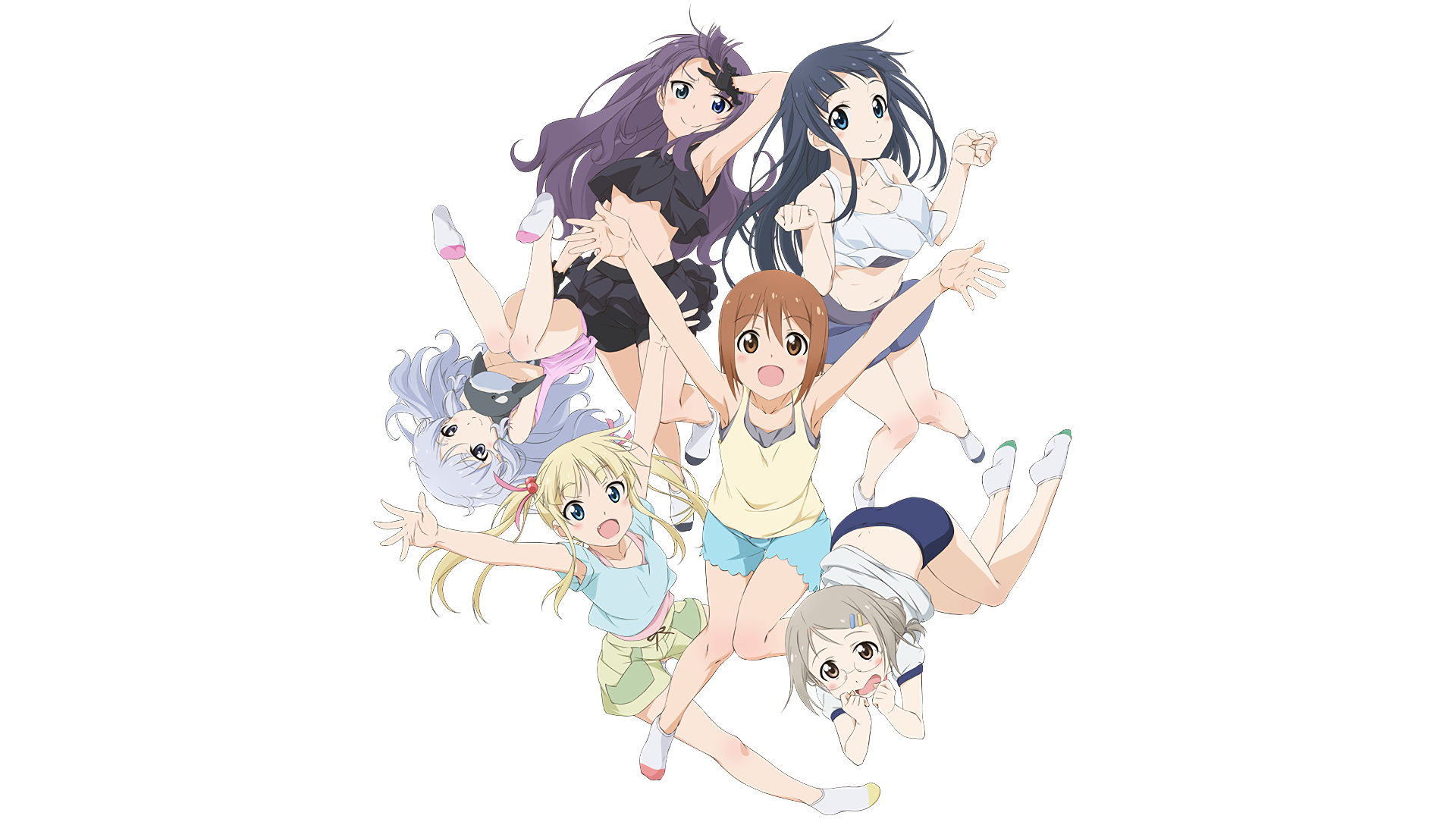 Description: A group of anime girls posing for a picture together with their arms around each other and their legs crossed.