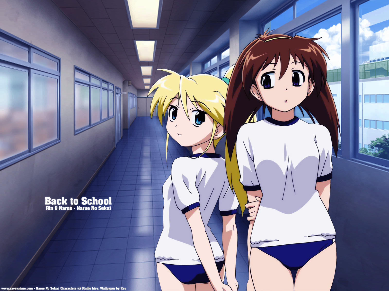 Description: Two anime girls in a hallway with a sky background and a window behind them that says back to school.