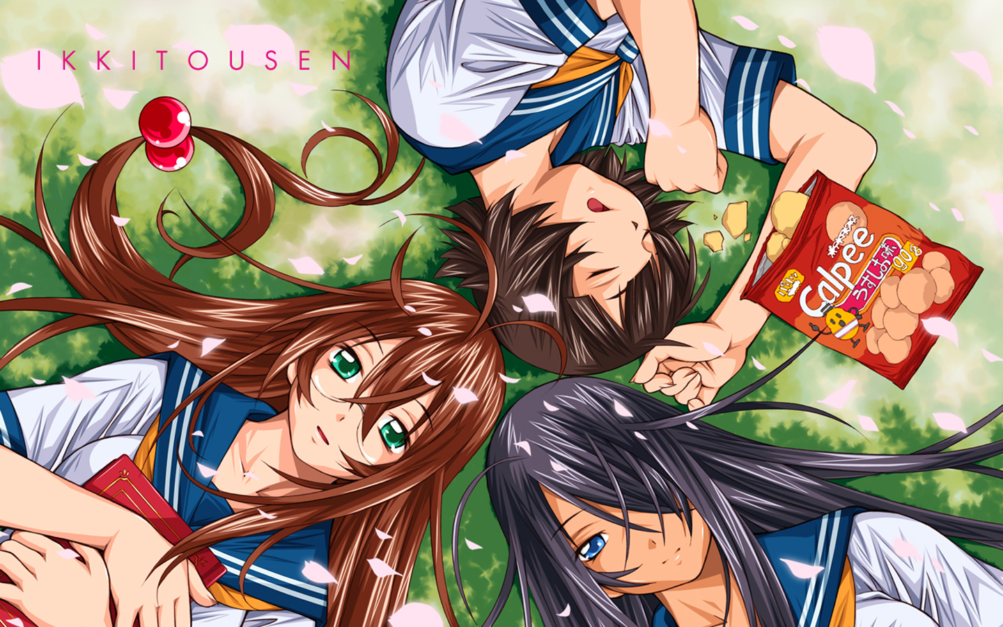 Description: Two anime characters laying on the ground with their hair blowing in the wind and a book in their hand.