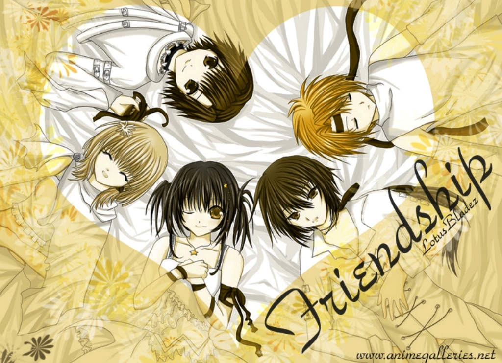 Description: A group of anime girls laying in a heart shape on a bed with the words friend ship written on it.