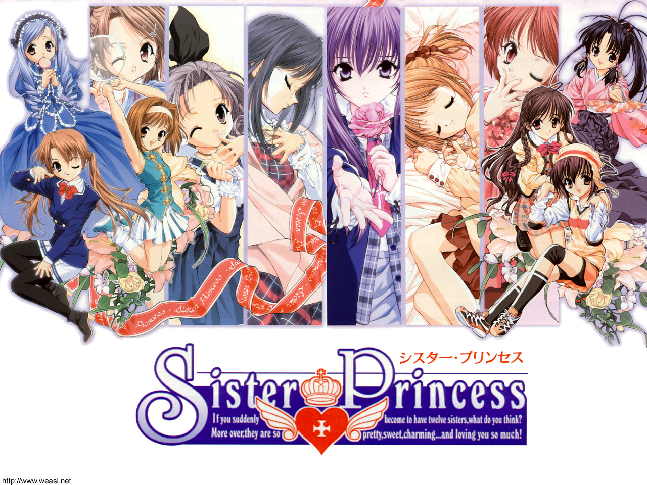 Description: A group of anime characters with a heart on the bottom of the image and a text that reads sister princess.