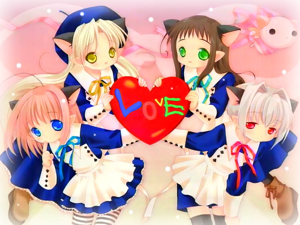 Description: Three anime girls holding a heart with the word love on it's chest and two of them are wearing sailor hats.