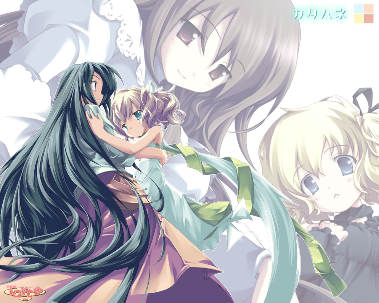 Description: A group of anime girls hugging each other in front of a white background with a blue sky in the background.