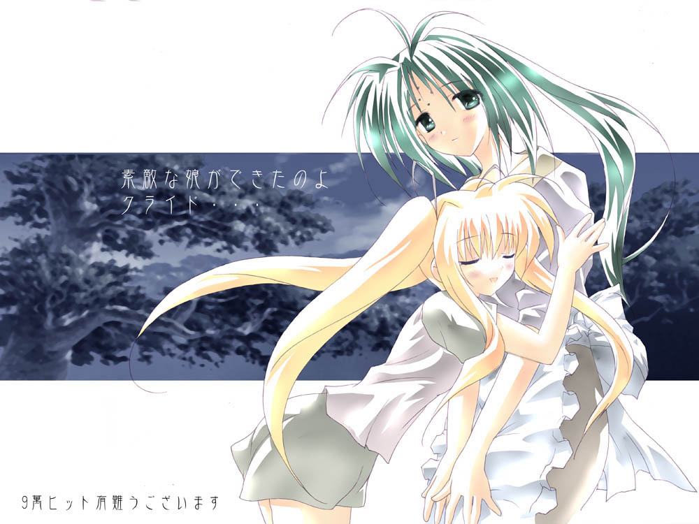 Description: A couple of anime girls standing next to each other in front of a tree and snow covered ground with trees in the background.