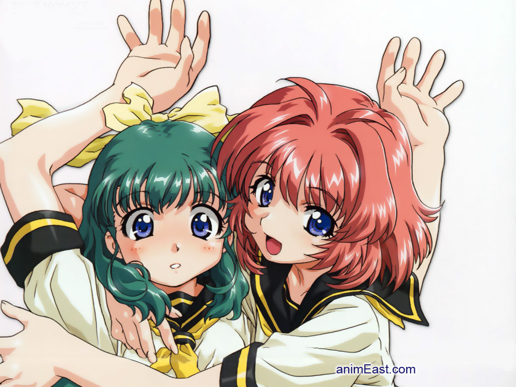 Description: Two anime girls hugging each other with their arms around each other and their arms around their shoulders.