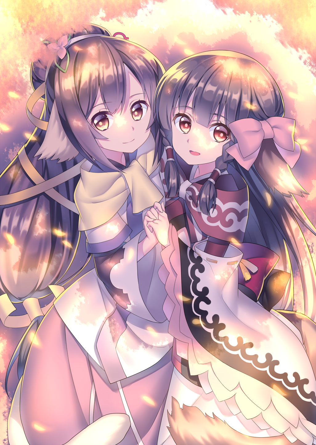 Description: Two anime girls hugging each other in front of a sky background with clouds and stars in the background.