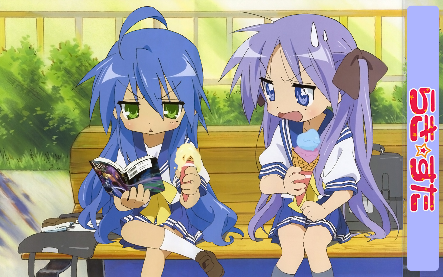 Description: Two anime girls sitting on a bench eating ice cream and reading a book together.
