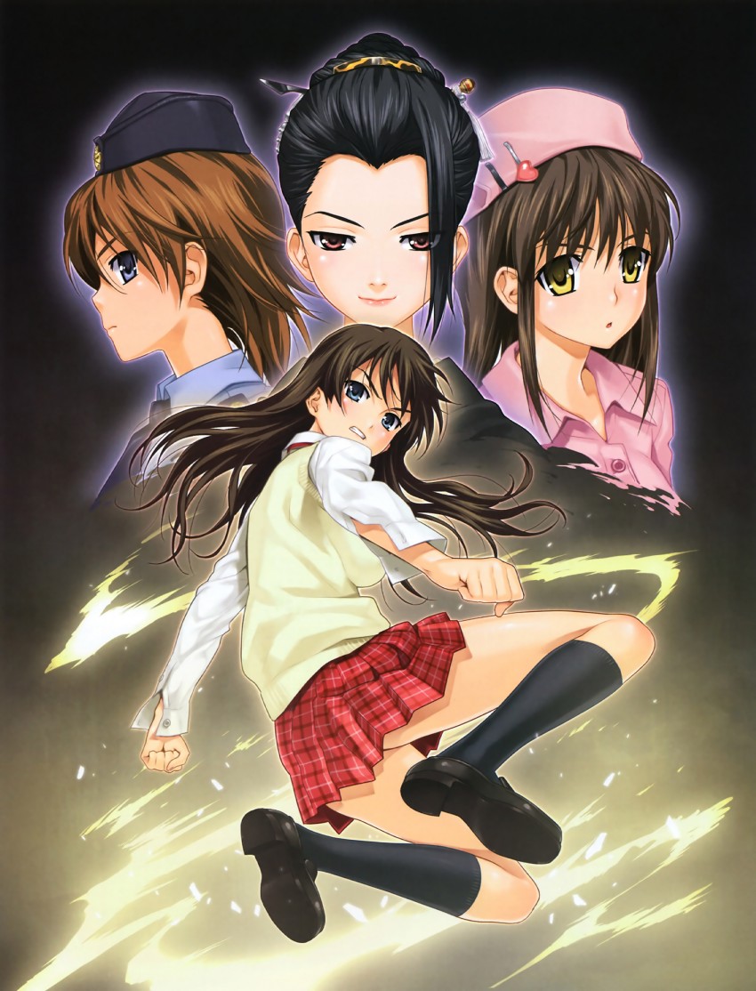 Description: A group of anime girls with long hair and a man in uniform behind them.