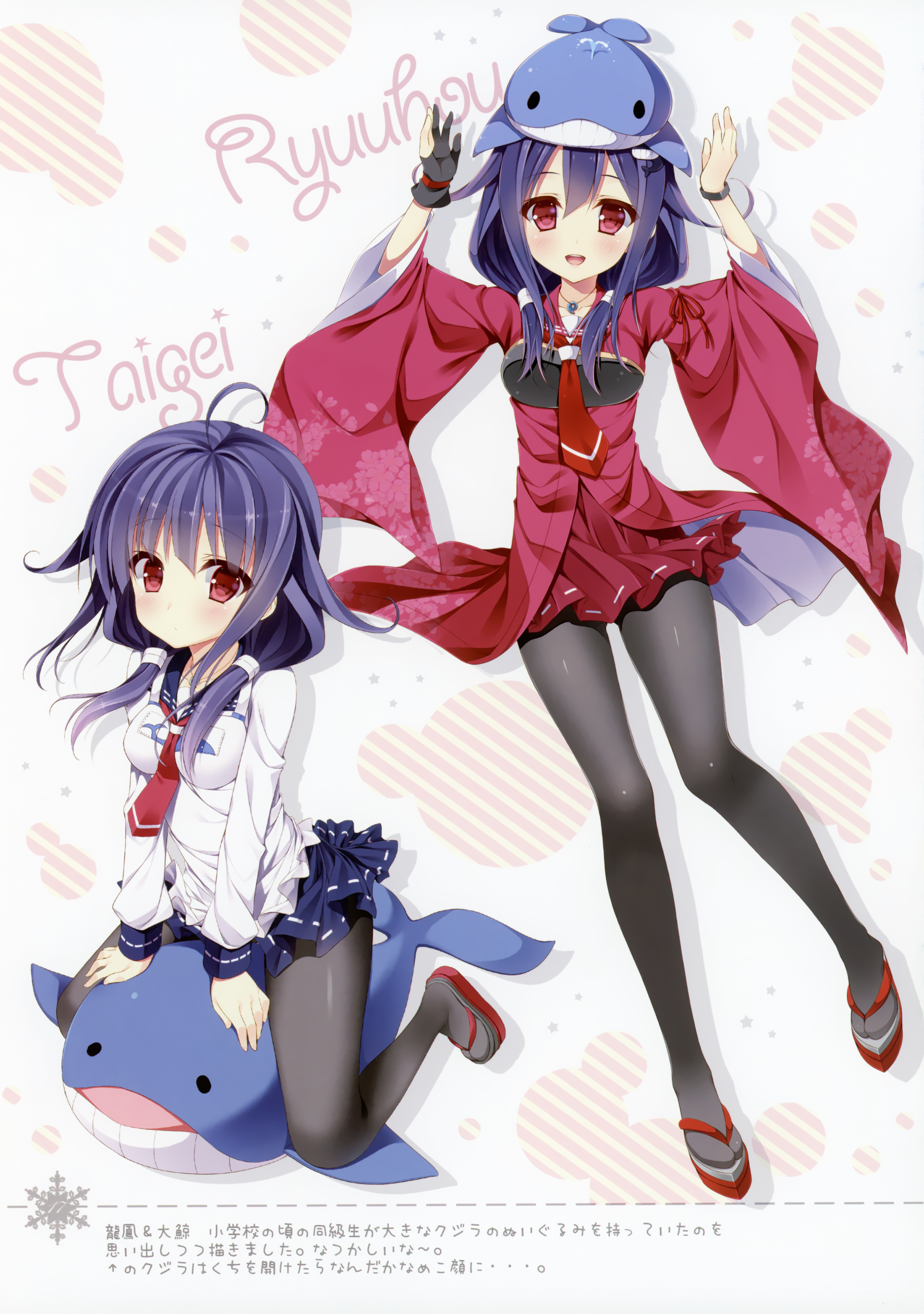 Description: Two anime girls with long hair and a red dress and a white shirt and a blue and white hat.