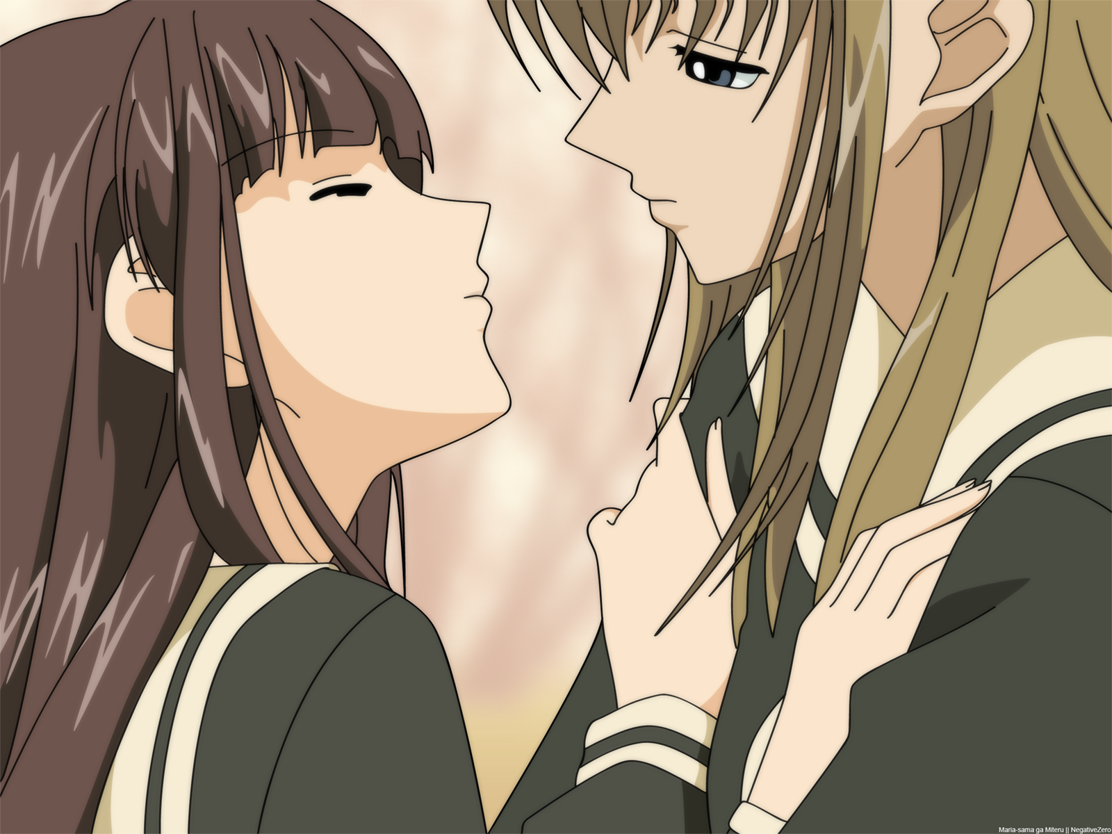 Description: Two anime girls with long hair and one has her hand on her face and the other has her hand on her face.