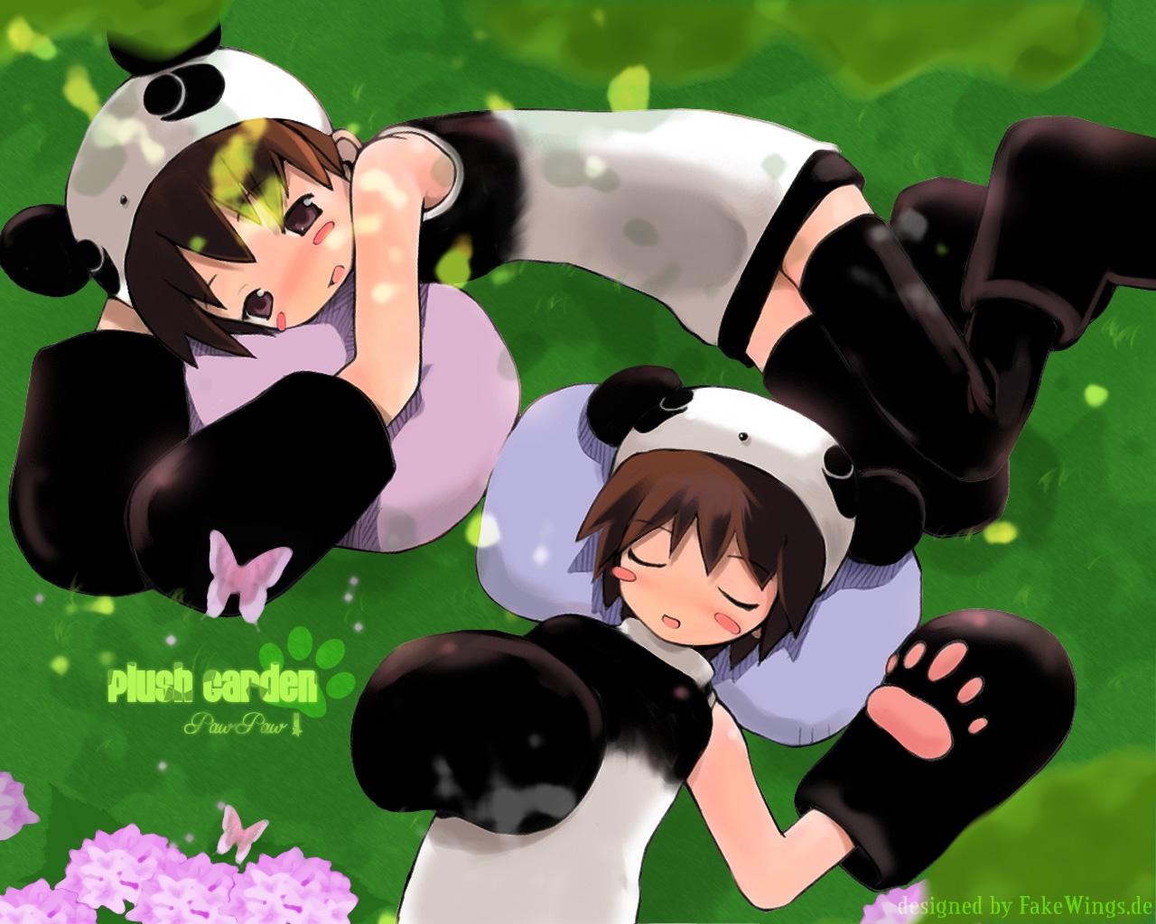 Description: Two anime characters laying on the ground with pandas on their backs and a panda bear on their back.