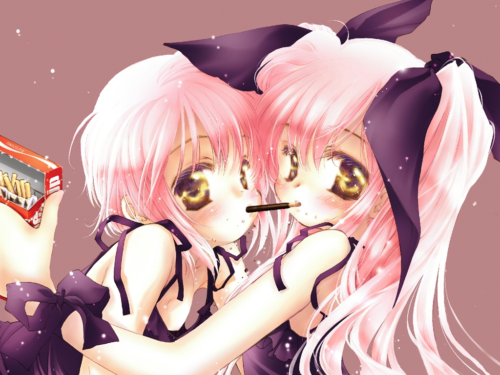 Description: Two anime girls with pink hair and a candy bar in their hands.