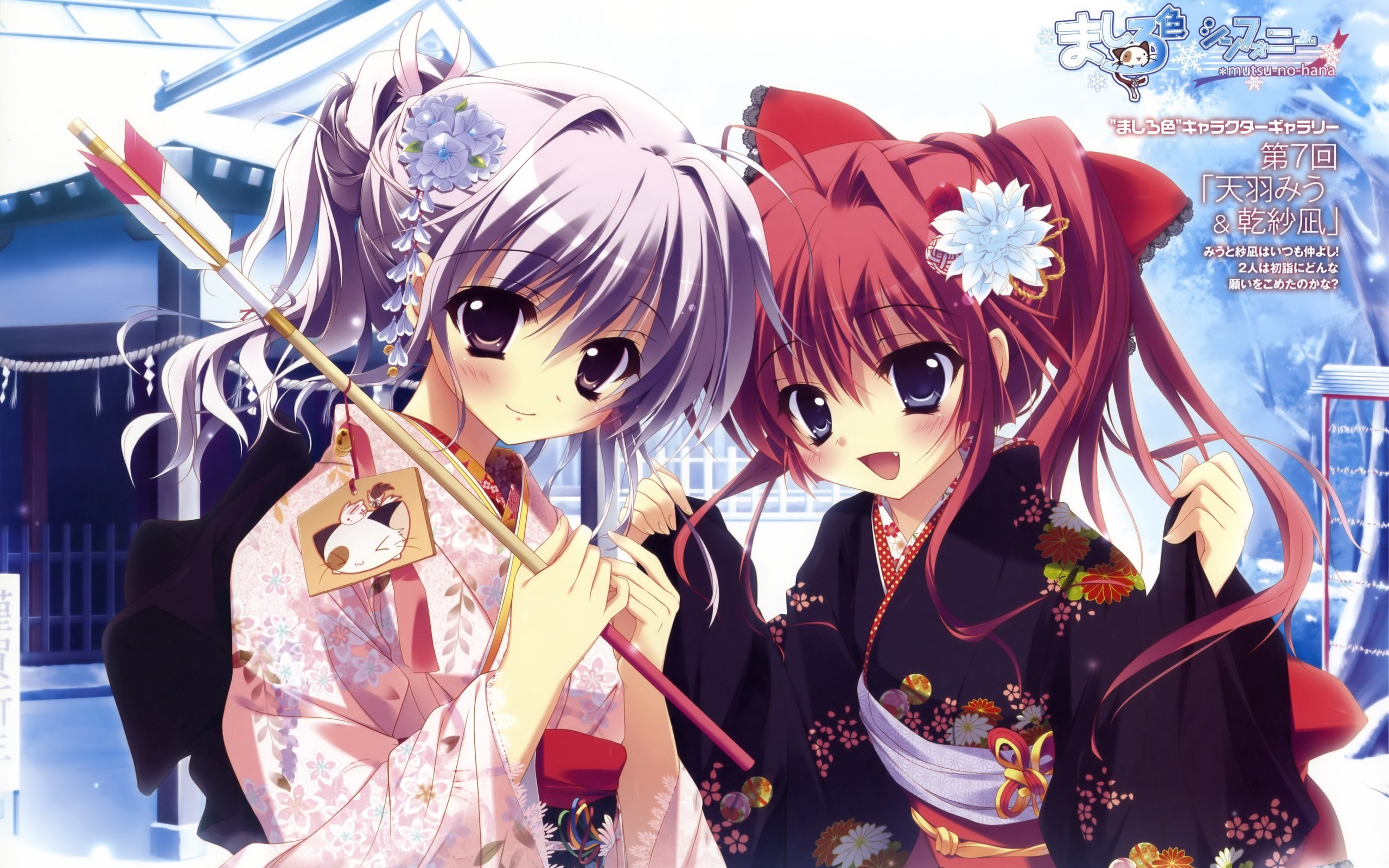 Description: Two anime girls with long hair and pink hair are standing together in front of a snowy background with snowflakes.