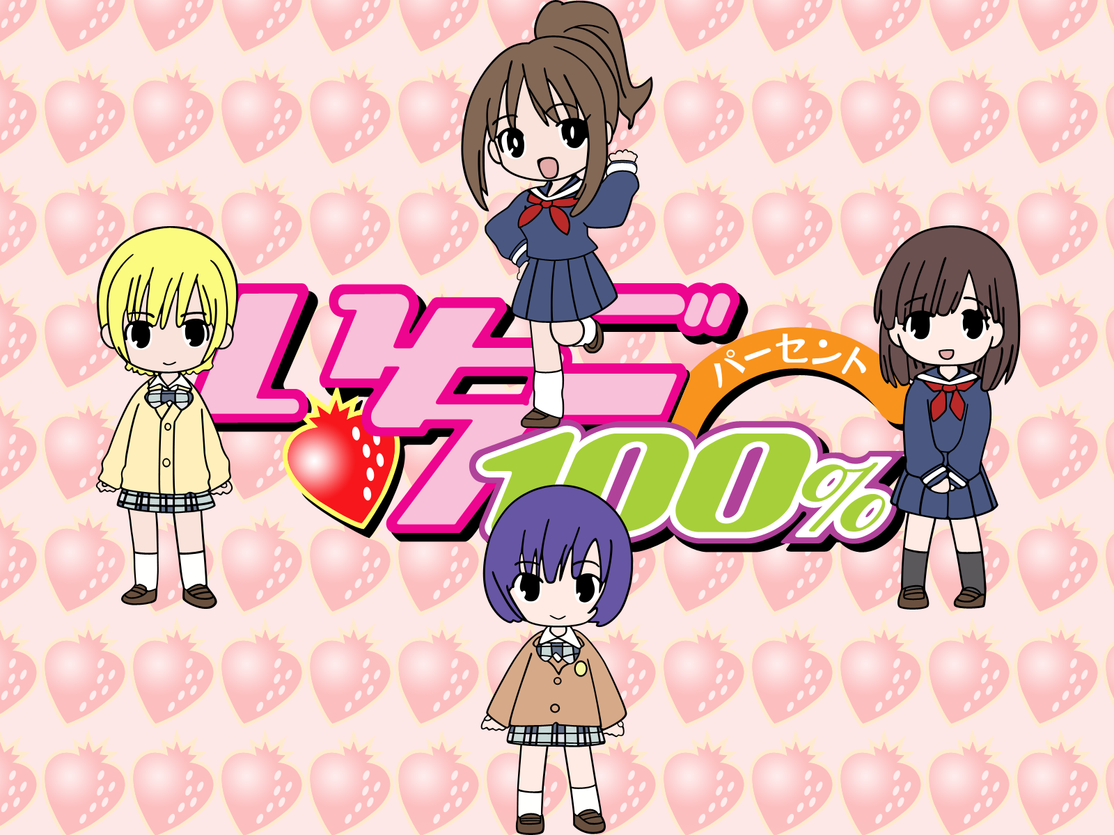 Description: A group of anime girls standing next to each other on a pink background with hearts and words in the background.