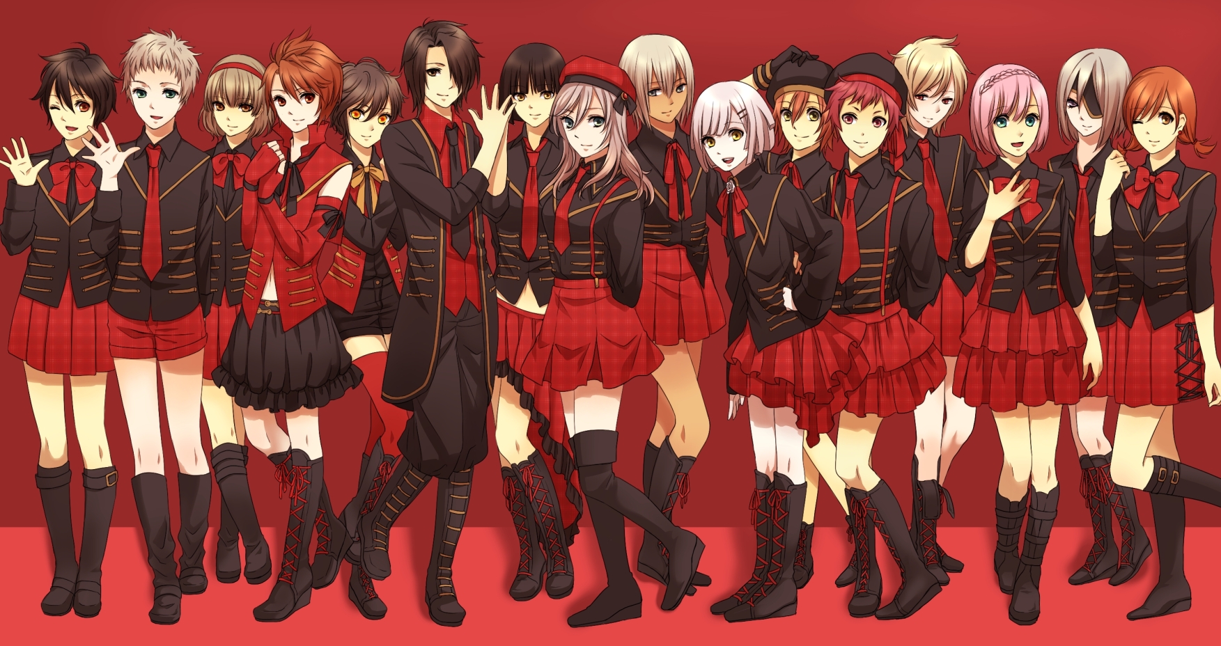 Description: A group of anime girls in red dresses and black boots posing for a picture together with their hands in their pockets.