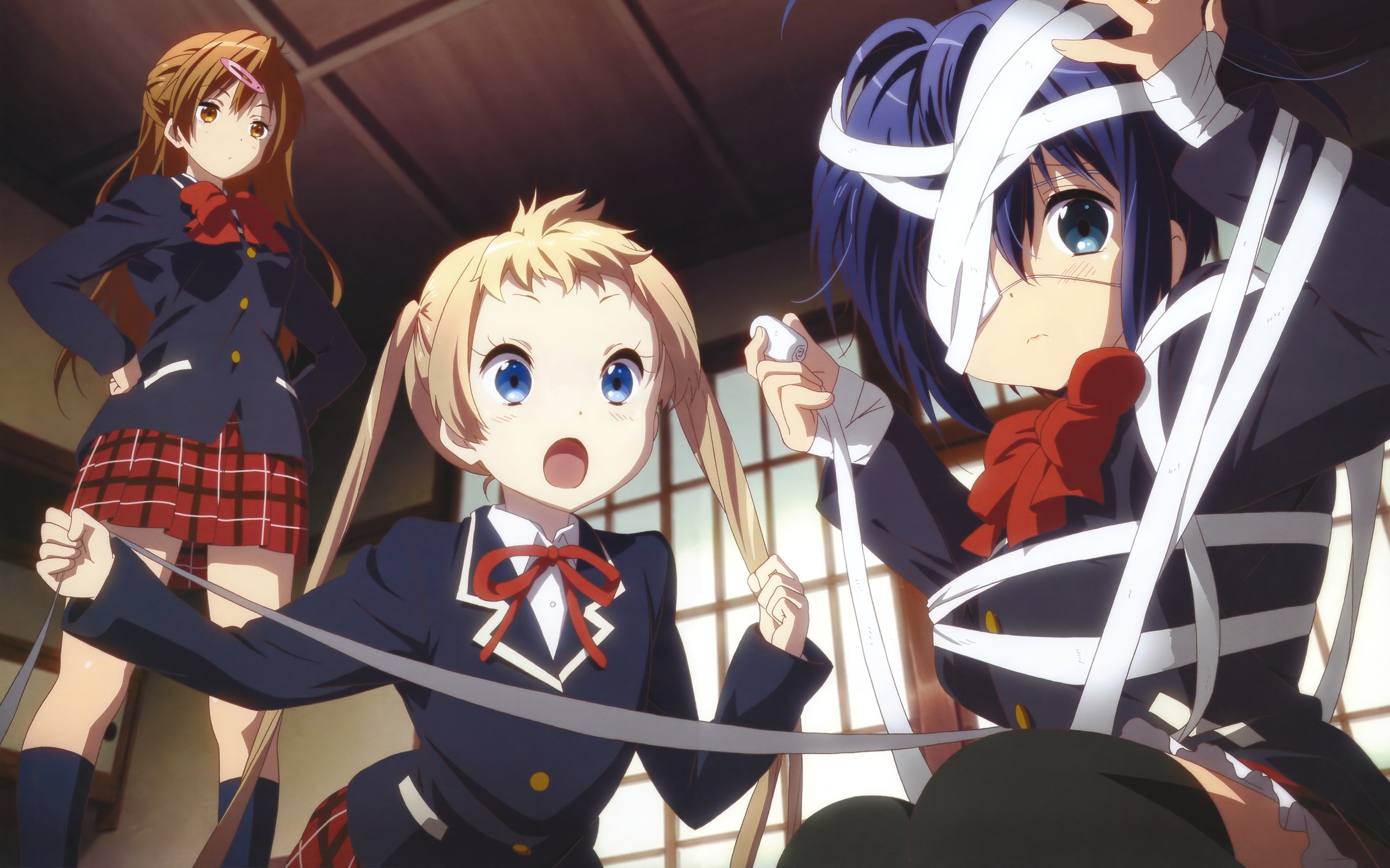 Description: A group of anime girls standing next to each other in a room with a ribbon around their necks and one girl holding a string.