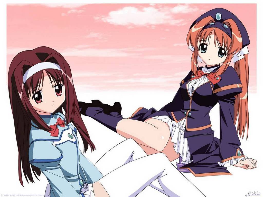 Description: Two anime girls sitting on the ground with one holding the other's leg up and the other holding the leg of the other.