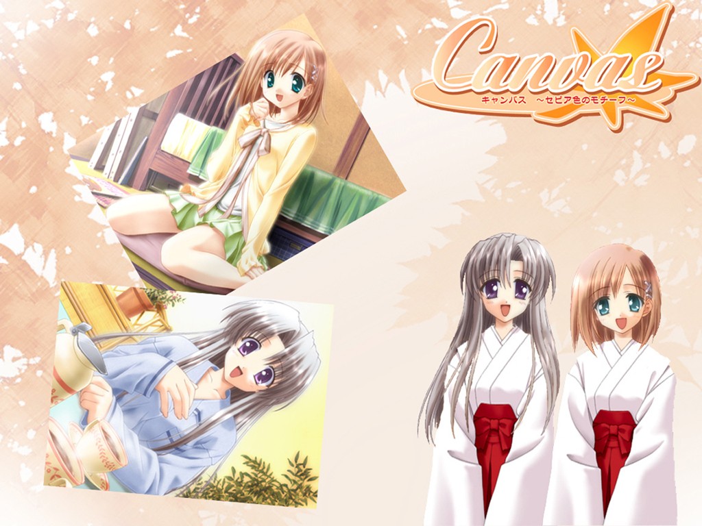 Description: A couple of anime girls sitting next to each other on a wall with a background of leaves and flowers.