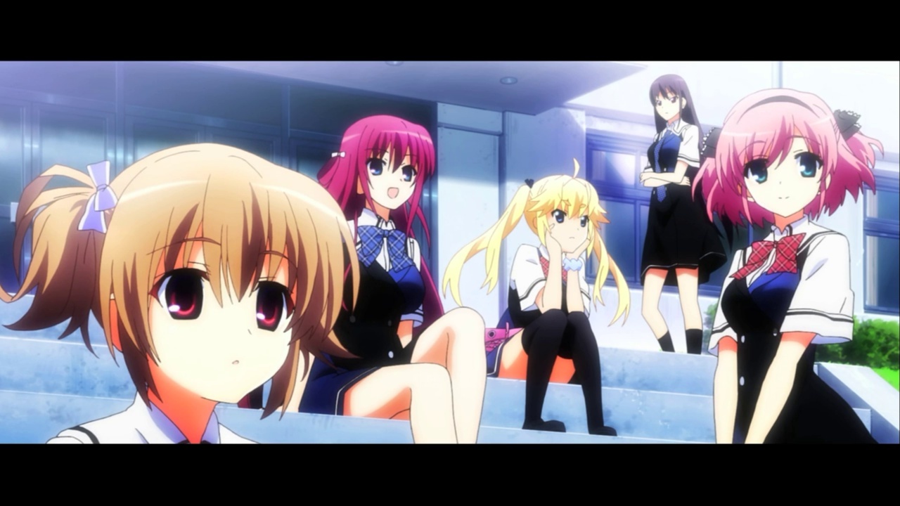 Description: A group of anime girls standing on a set of stairs in front of a building with their hands on their hips.