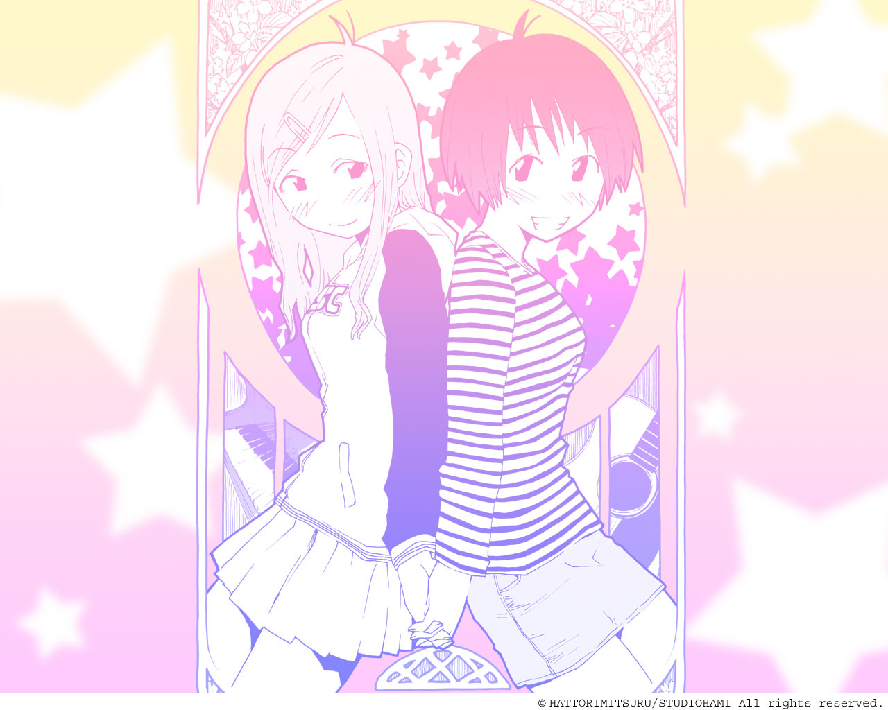Description: Two anime girls with stars in the background and a pink and yellow background with stars on it.