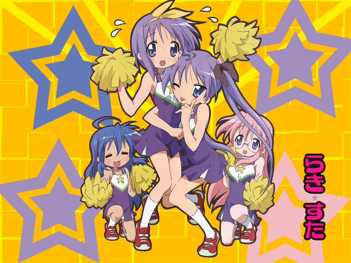 Description: A group of anime girls with stars in the background and a yellow background with stars in the background and a yellow background with stars.