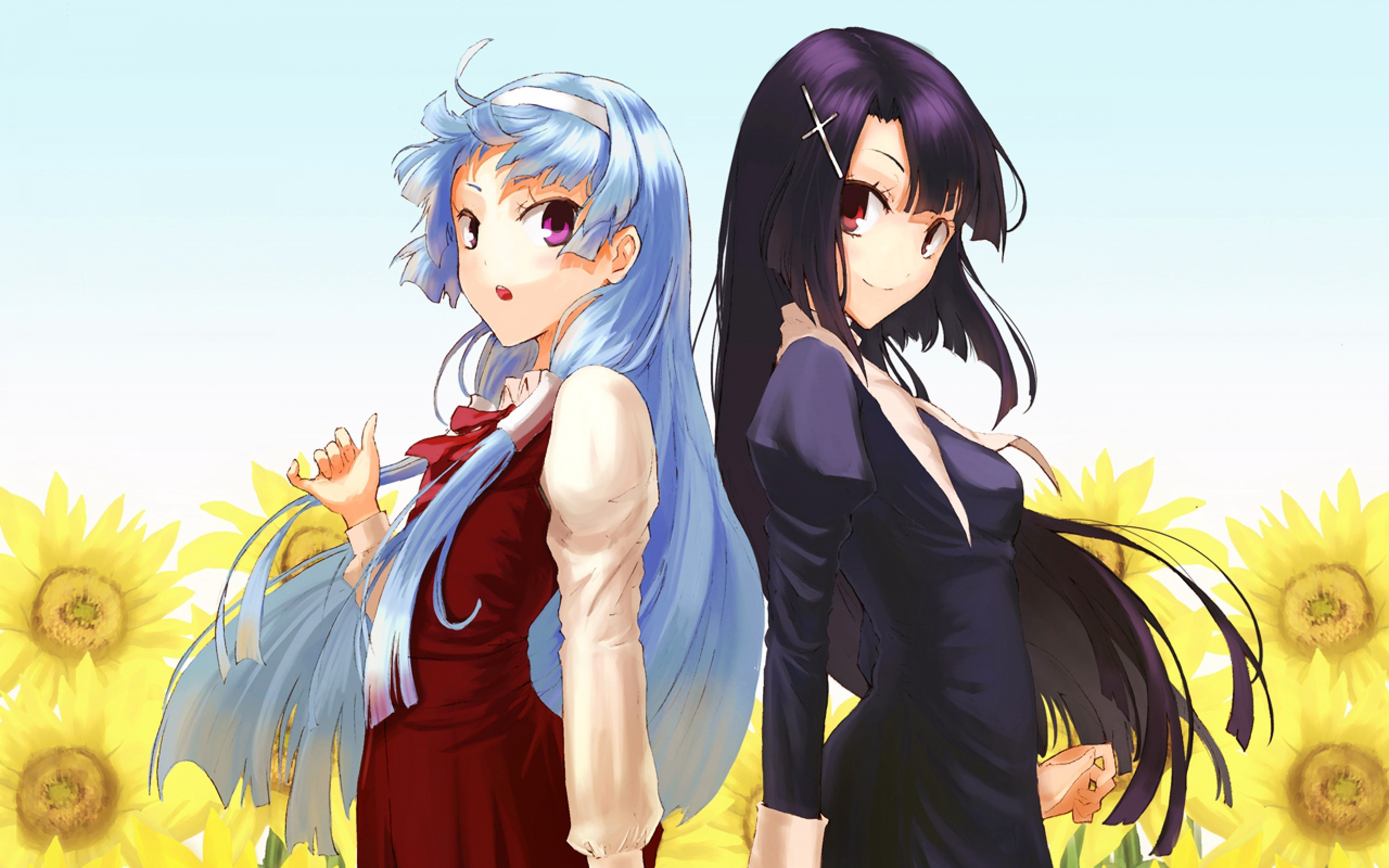 Description: Two anime girls standing in a field of sunflowers with long hair and blue eyes.