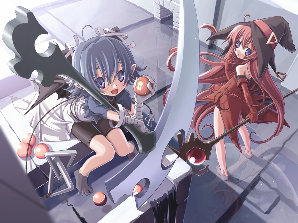 Description: Two anime girls sitting on a ledge with a sword and a ball in their hands.