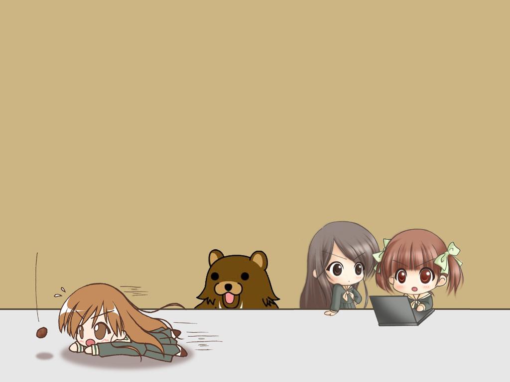 Description: A group of anime girls sitting at a table with a laptop computer in front of them and a bear on the floor.