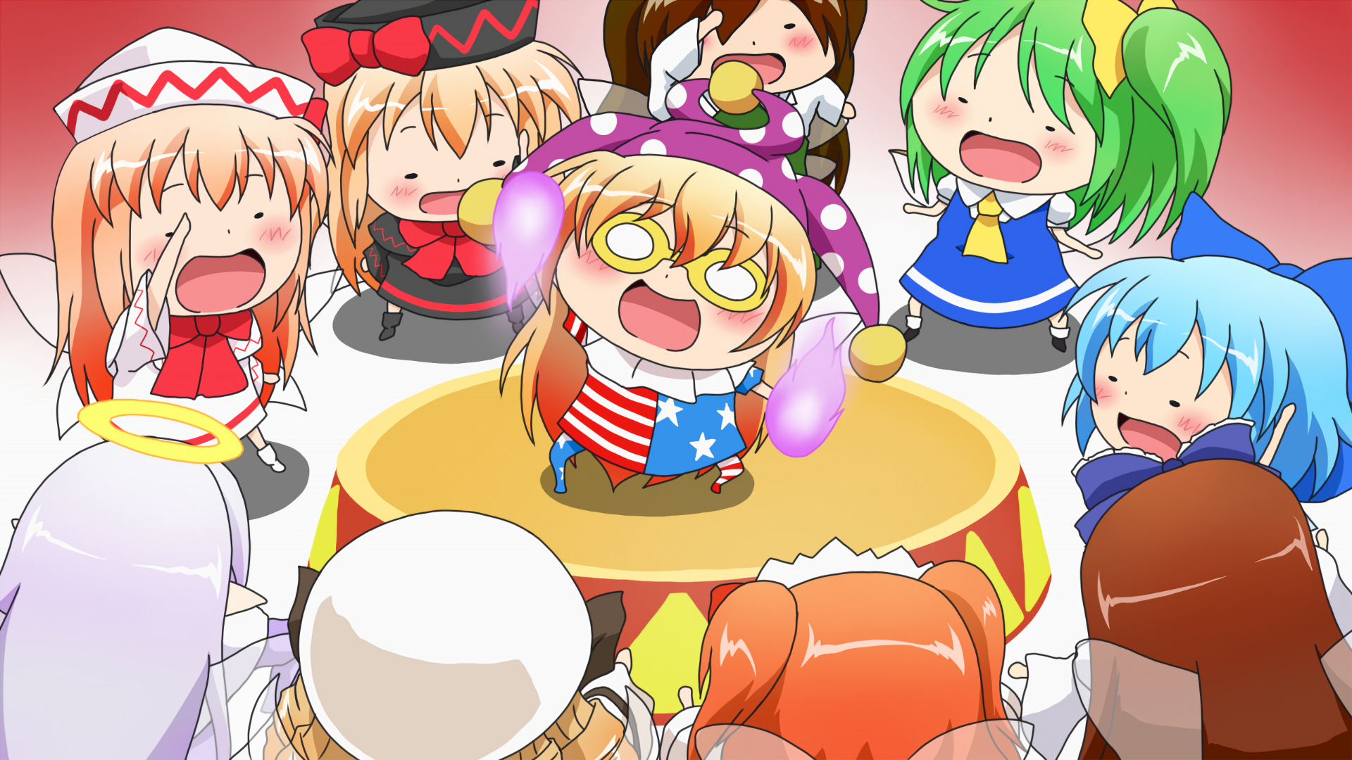 Description: A group of anime girls sitting around a table with a microphone in front of them and a man standing behind them.