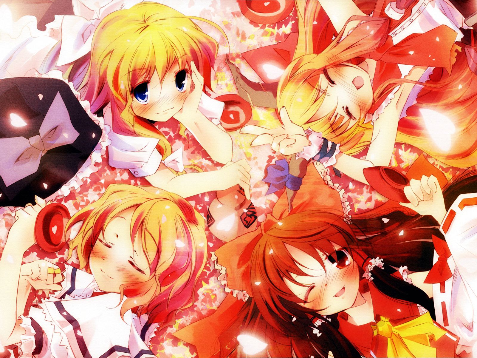 Description: A group of anime girls with umbrellas in the air and a man holding a umbrella in the air.