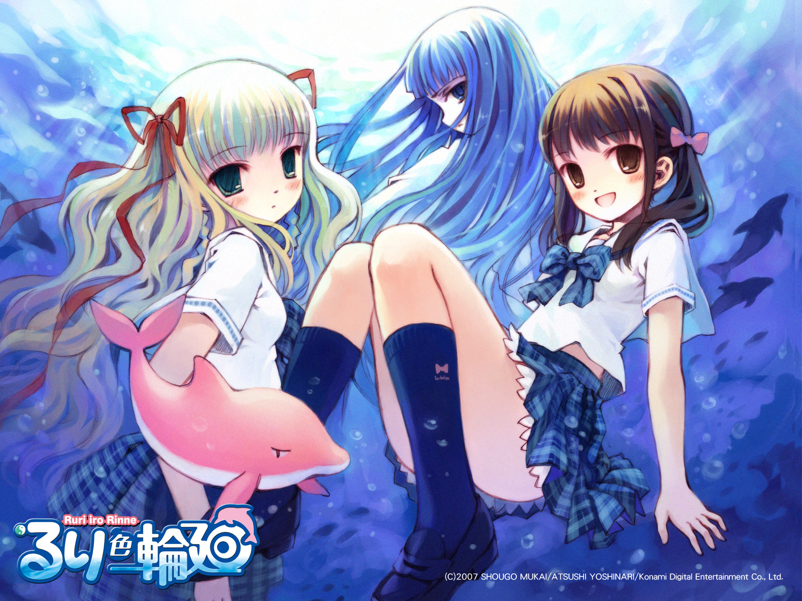 Description: Two anime girls sitting next to each other in the water with a shark in their hand and a fish in their other hand.