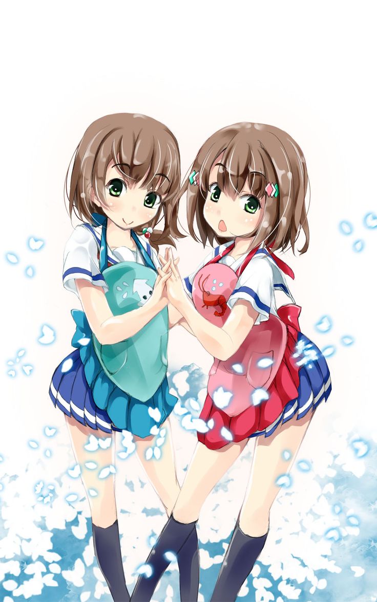 Description: Two anime girls standing next to each other in the water with bubbles on them and one girl holding a teddy bear.