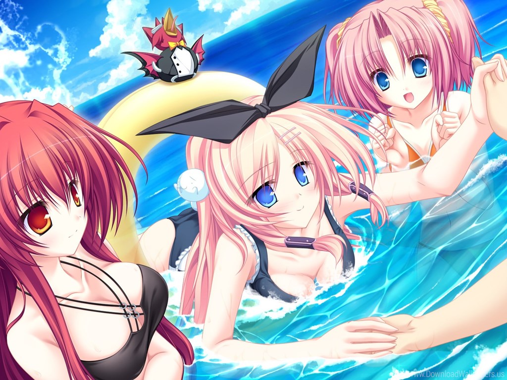 Description: Three anime girls in the water with a cat on their head and a bird on their shoulder.