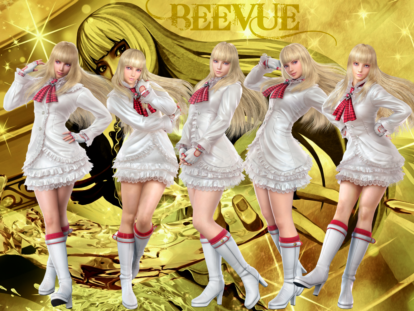 Description: A group of anime girls in white outfits and boots with gold background and gold leaves and a gold clock.