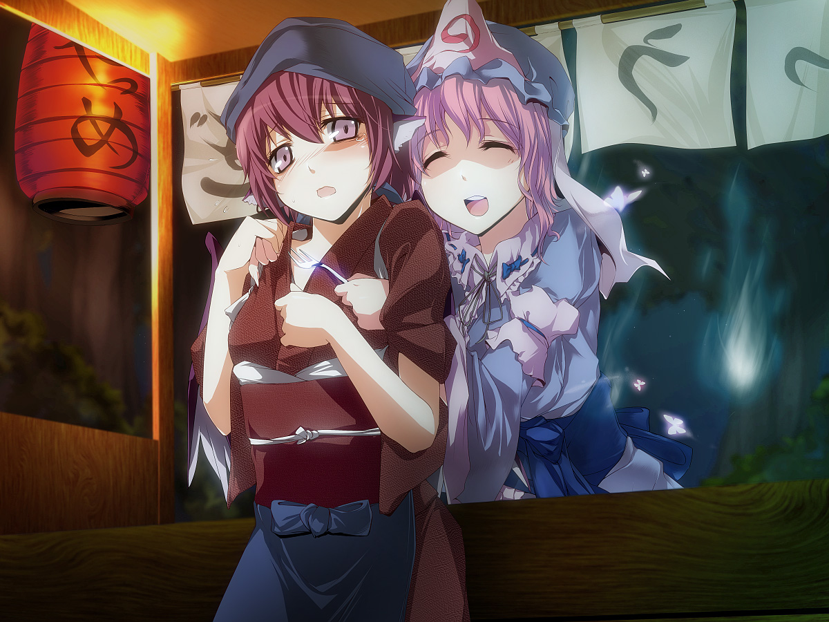 Description: Two anime girls standing next to each other in front of a window with a japanese flag behind them and a sign that says.