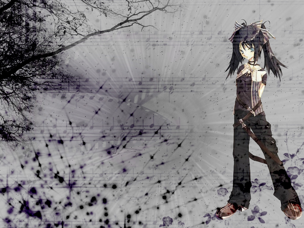 Description: A anime character with long hair and a black outfit is standing in front of a tree with branches and branches.