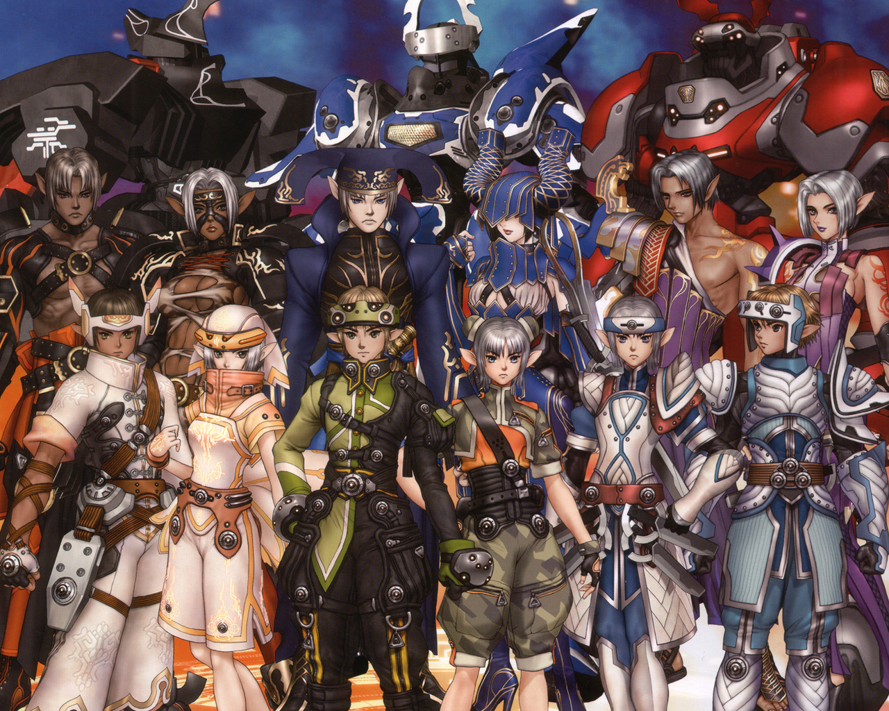 Description: A group of anime characters standing next to each other in front of a blue background with a sky background.