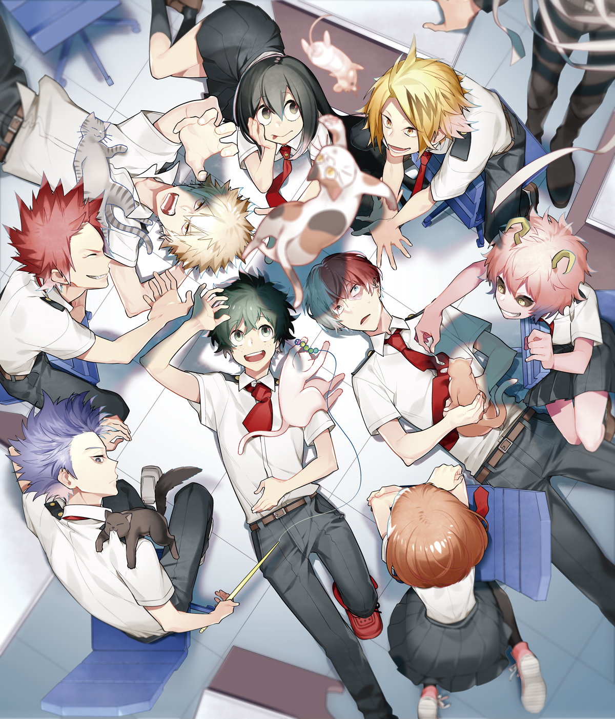 Description: A group of anime characters sitting on a blue bench together with their hands in their pockets and their legs crossed.