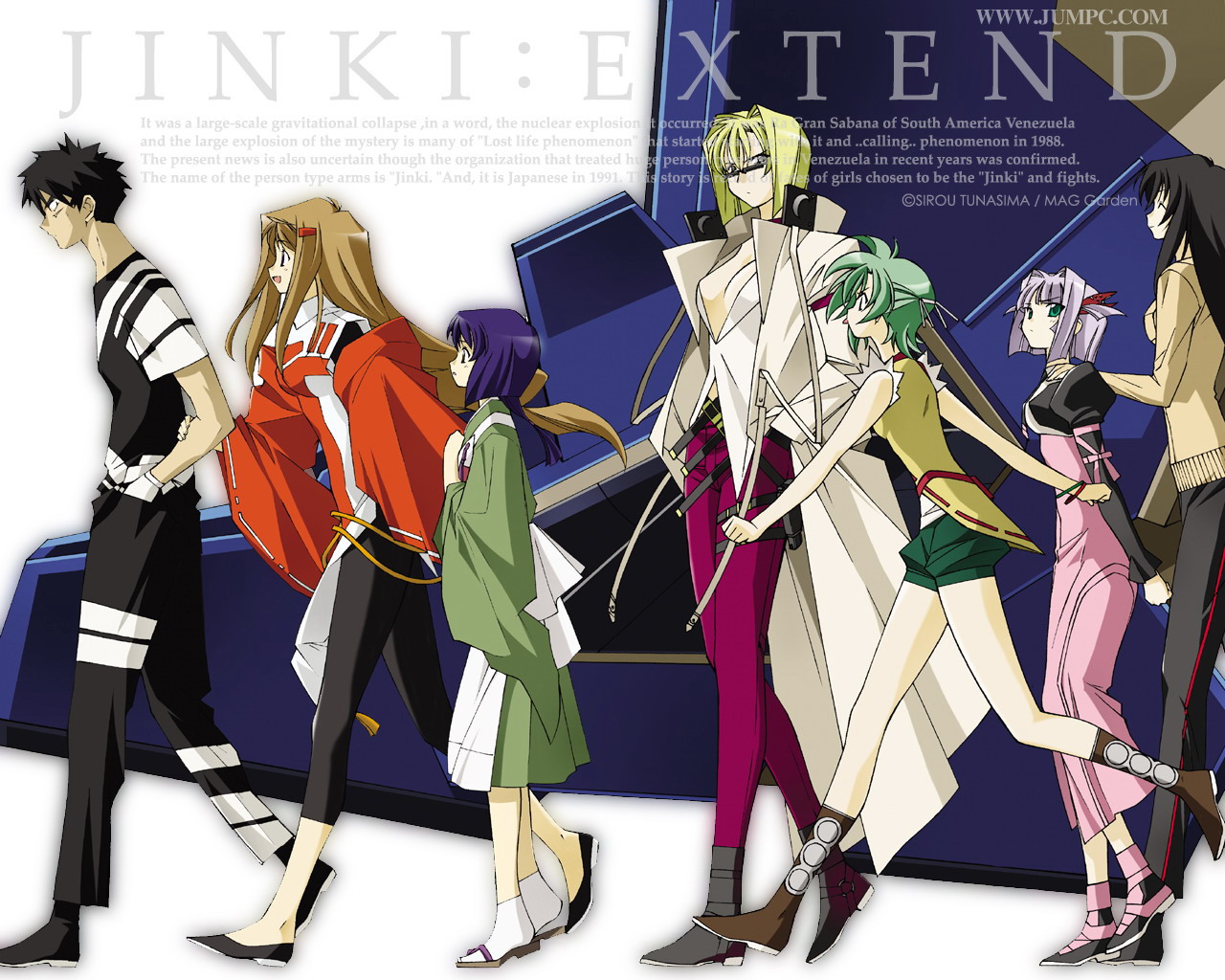 Description: A group of anime characters walking together in front of a blue car with a white background and a white background.