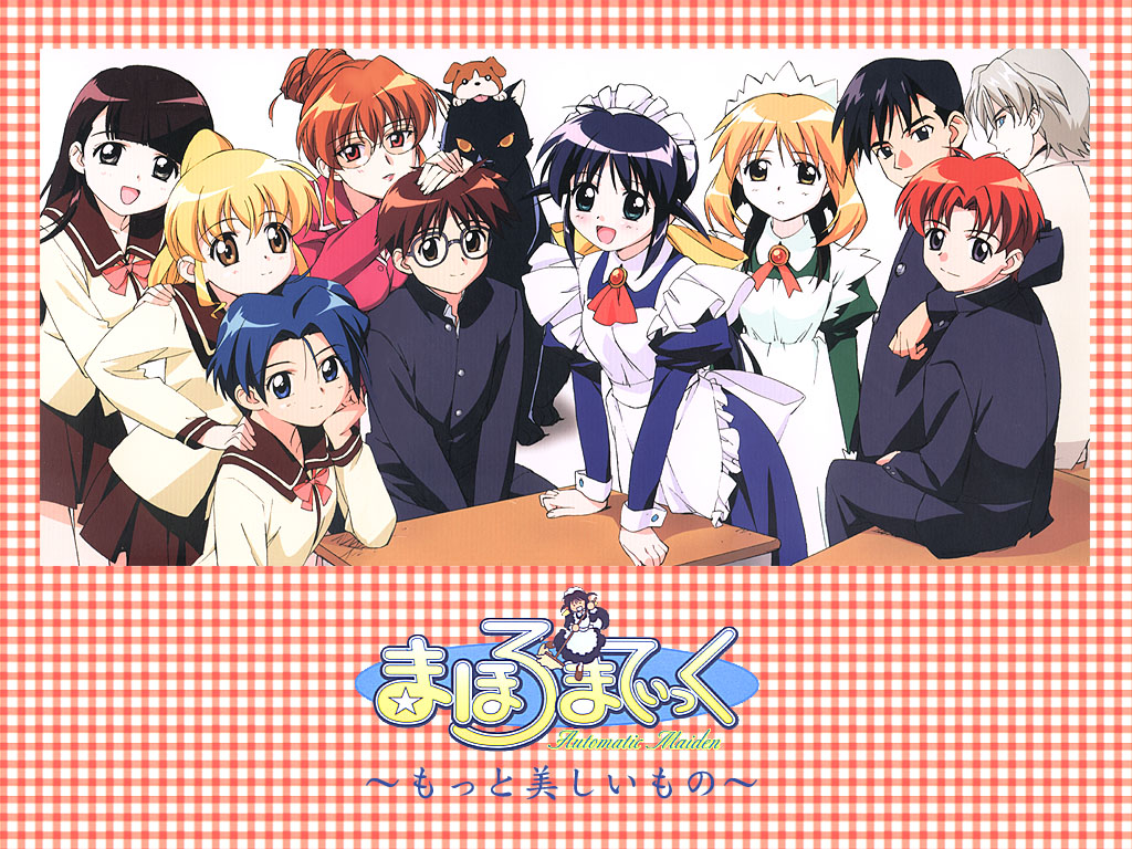 Description: A group of anime characters posing for a picture together in front of a checkered background with the words.