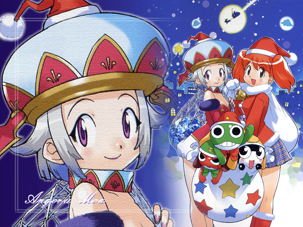 Description: A group of anime characters standing next to each other in front of a blue background with stars and snow.