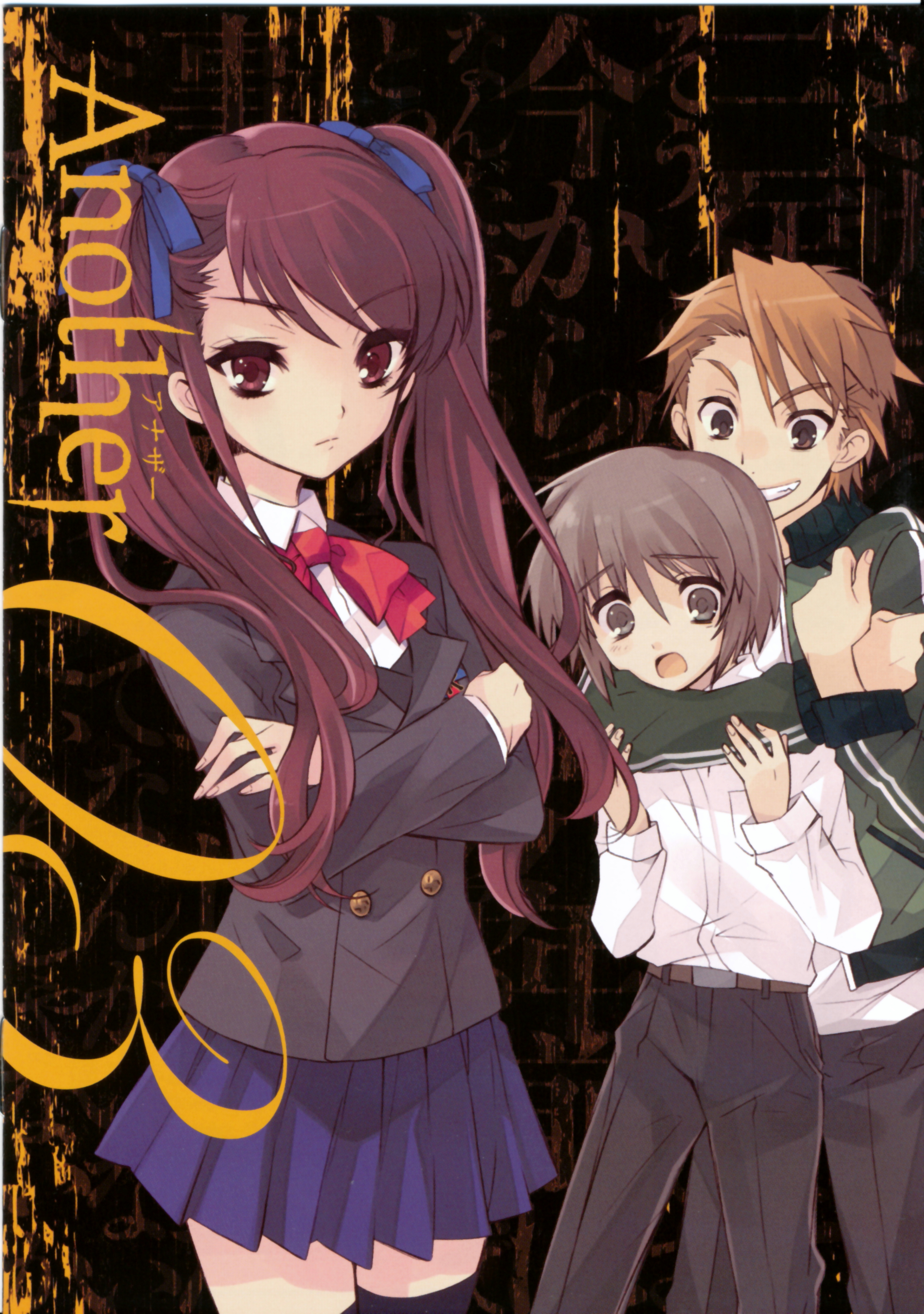 Description: A group of anime characters standing next to each other in front of a black background with gold lettering and a gold frame.