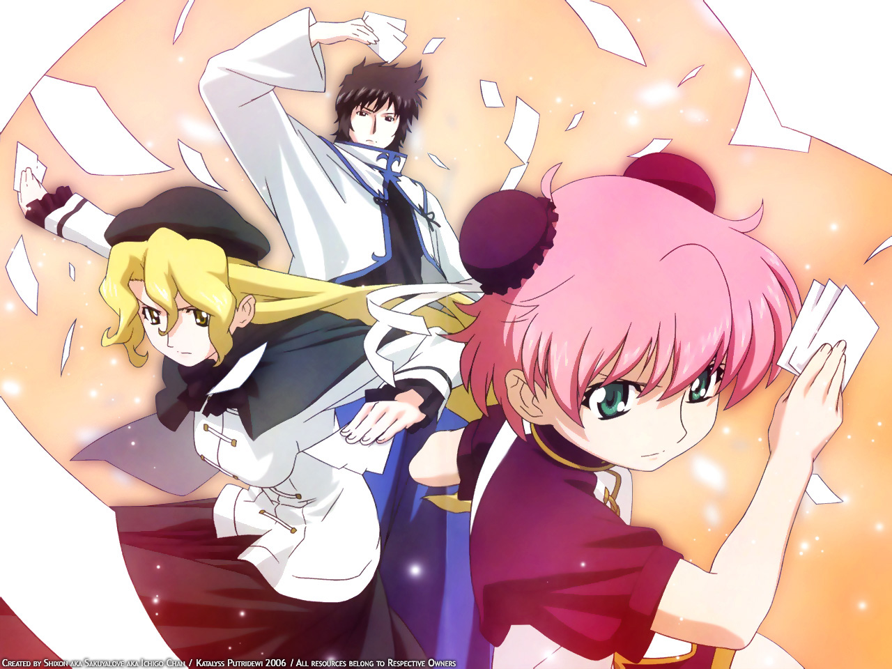 Description: A group of anime characters standing next to each other in front of a circular background with stars and bubbles.