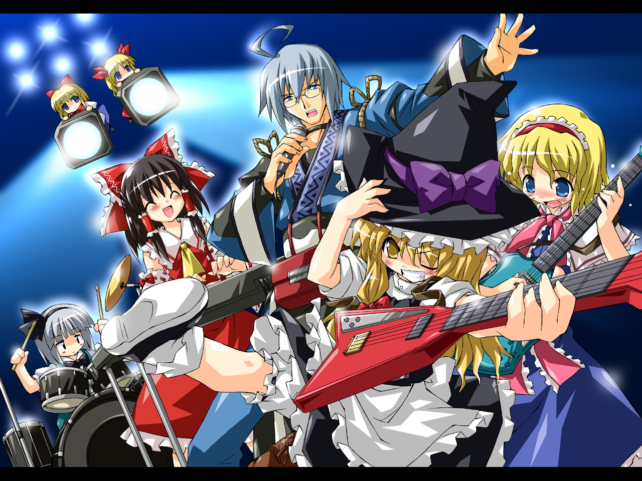 Description: A group of anime characters with guitars and guitars in front of a stage with lights and a spotlight behind them.