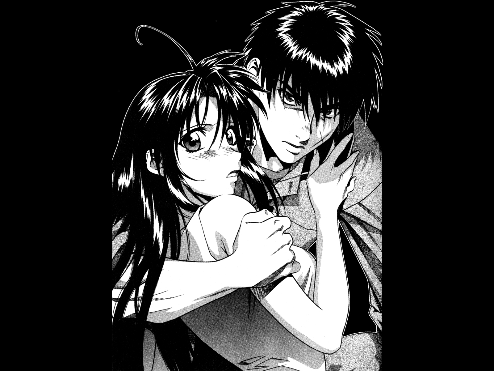 Description: A couple of anime characters hugging each other in a black and white photo with a black background and a black background.