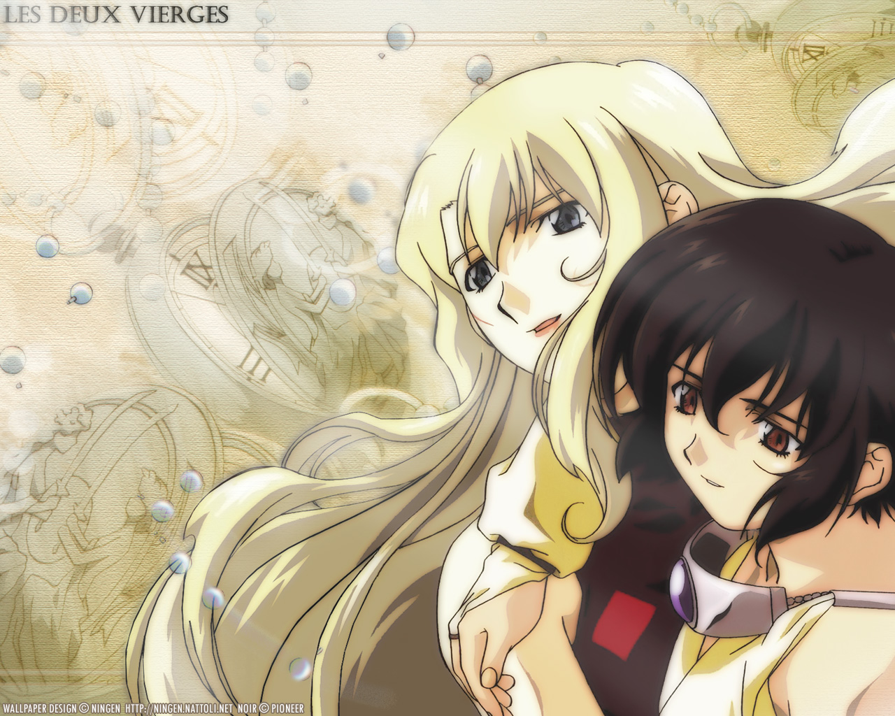 Description: Two anime characters are hugging each other in front of bubbles and bubbles on a beige background with a swirly pattern.