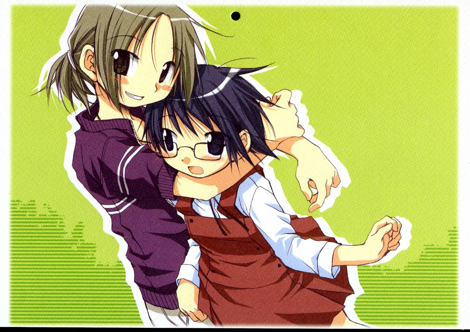 Description: A couple of anime characters hugging each other with a green background behind them and a green background behind them.